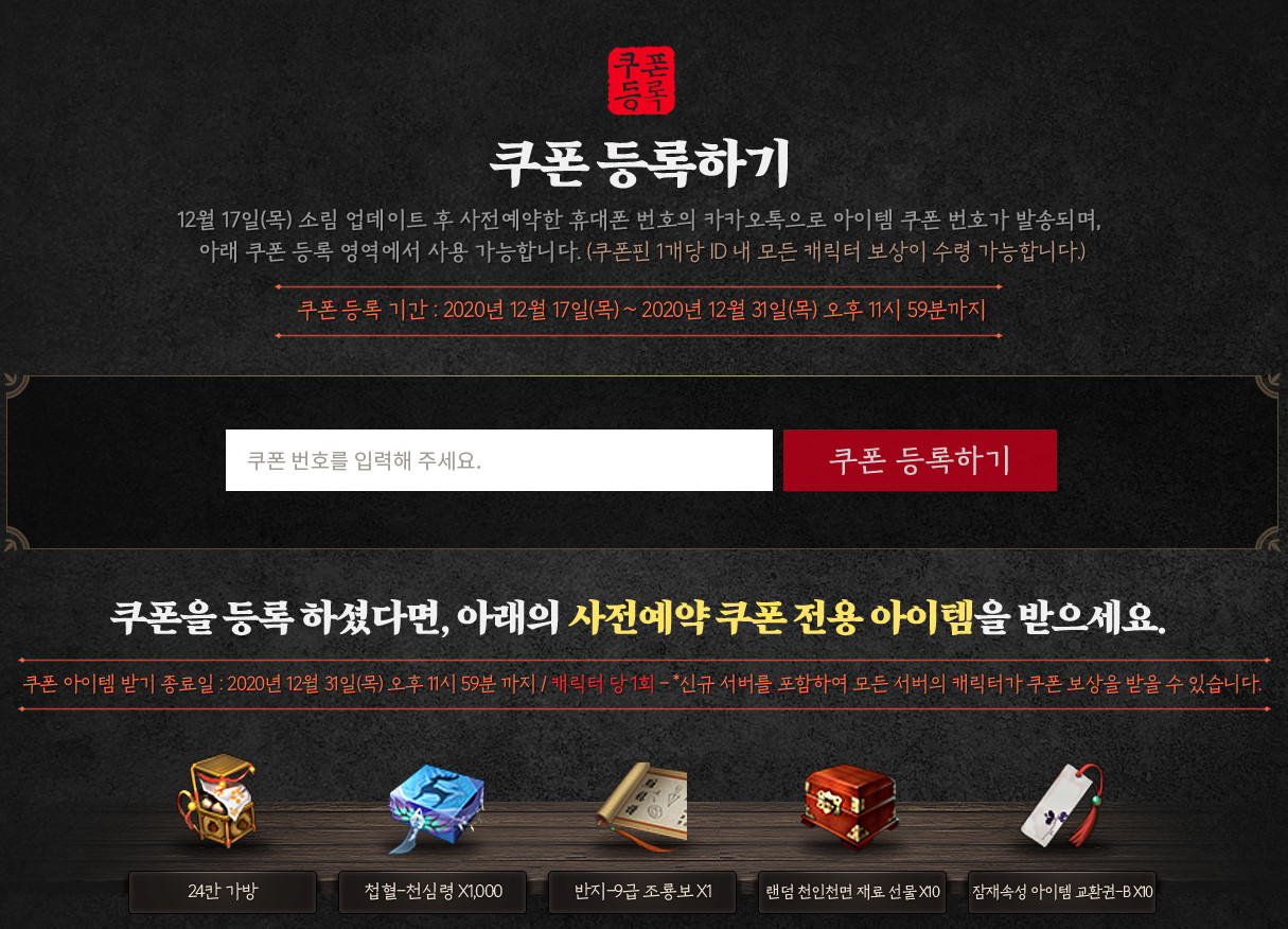 사전예약 보상은 폰 번호로만 가능하며, 12월 16일(수) 오후 11시 59분까지 진행하셔야 합니다. 그래야 보상으로 주는 귀옥-중급 강화석 700개 / 연재-고급 2개 / 천애 통행권 5개 / 불견천(영구) 아이템을 받을 수 있습니다.