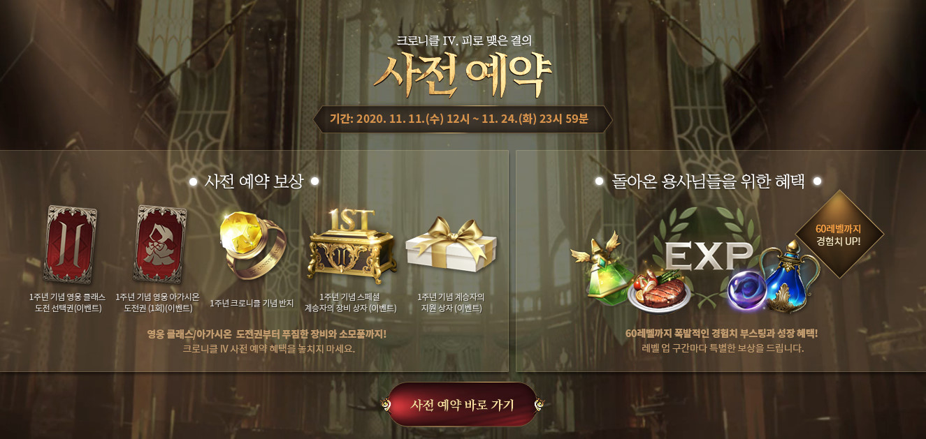 사전예약 진행시 1주년 기념 영웅/아가시온 도전 선택권, 기념 반지, 계씅자의 장비 상자, 지원 상자 등을 받을 수 있으며 복귀유저에게는 60레벨까지 폭발적인 경험치 부스팅과 성장을 도와주는 아이템을 레벨업 구간마다 지급한다고 합니다.