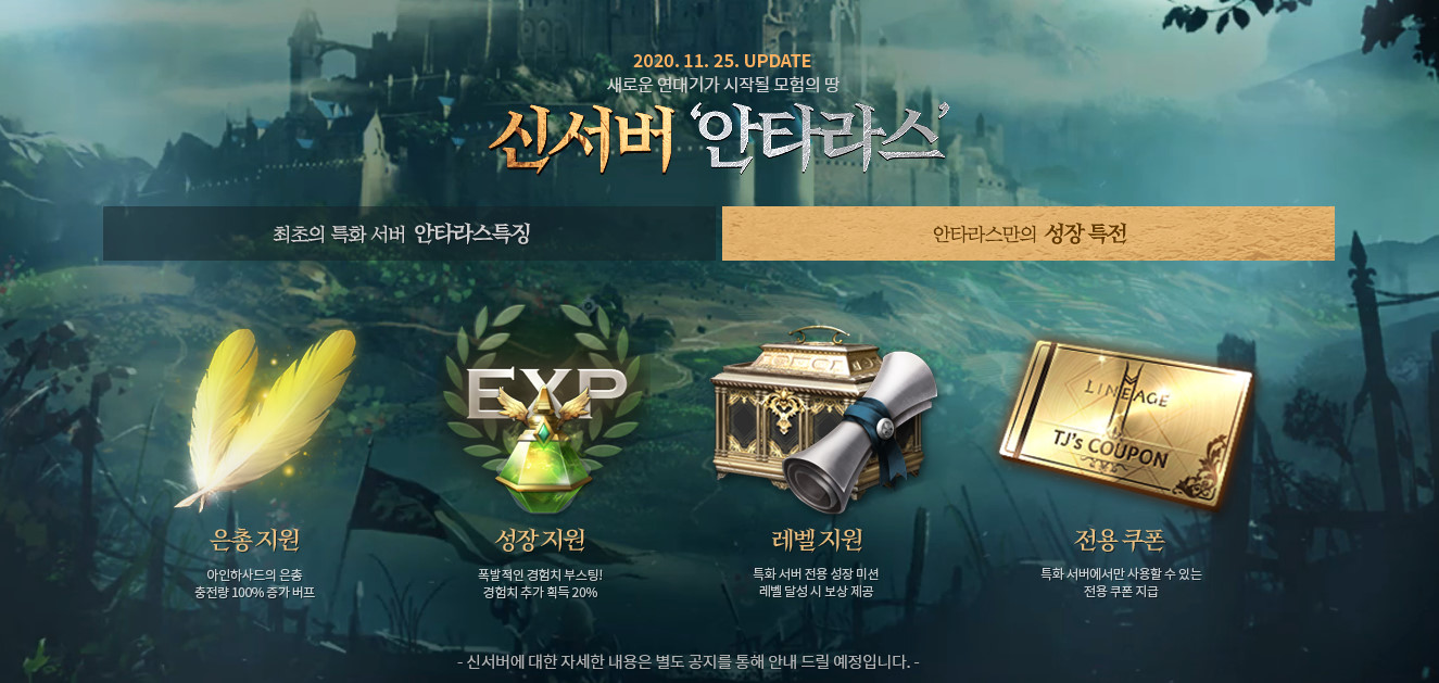 신서버 안타라스는 최초의 특화서버로 안정적인 모험을 위해 일부 컨텐츠가 비활성화 된 상태로 오픈이 되는 것이 특징입니다. 비활성화 된 컨텐츠는 유저들의 레벨이 높아짐에 따라 서버에 차차 순차적으로 오픈해 나갈 것이라고 합니다. 신서버 안타라스는 은총,성장, 레벨 지원과 전용 TJ 쿠폰을 지급할 것이라고 하네요.