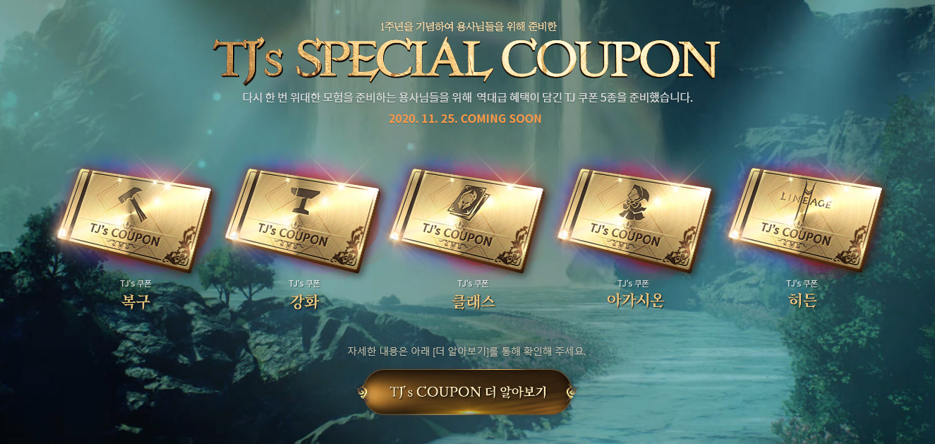 1주년을 맞이하여 리니지2m TJ 쿠폰을 4개 + 히든 쿠폰까지해서 5개를 준비했다고 합니다. 복구 쿠폰, 강화 쿠폰, 클래스 쿠폰, 아가시온(펫) 쿠폰, 히든 쿠폰이렇게 있습니다. 복구 쿠폰은 강화 실패 증발한 아이템 1종을 복구 할 수 있고, 클래스 쿠폰은 합성 이력의 최대 등급 클래스 1회 도전, 아가시온도 마찬가지이며, 강화 쿠폰은 유료 장비 강화 중 실패시 재시도를 할 수 있다고 합니다. 히든 쿠폰은 25일 공개됩니다.