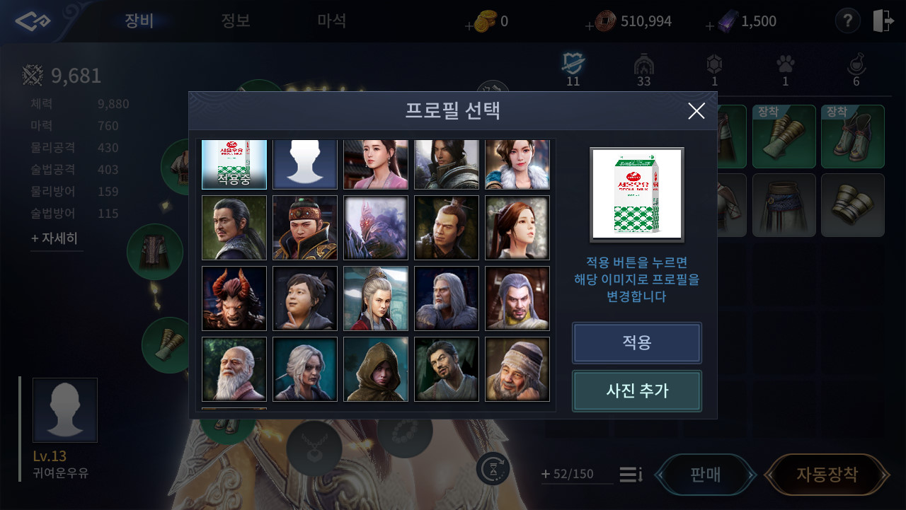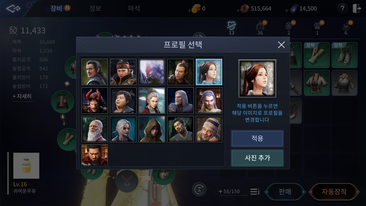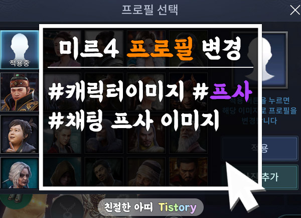 이제 원하는 미르4 스토리 등장 캐릭터들 중 하나를 선택 - 적용 하시면 됩니다. 이렇게 하시면 전체 채팅, 문파 채팅 에서도 해당 캐릭터의 이미지가 보이게 됩니다.