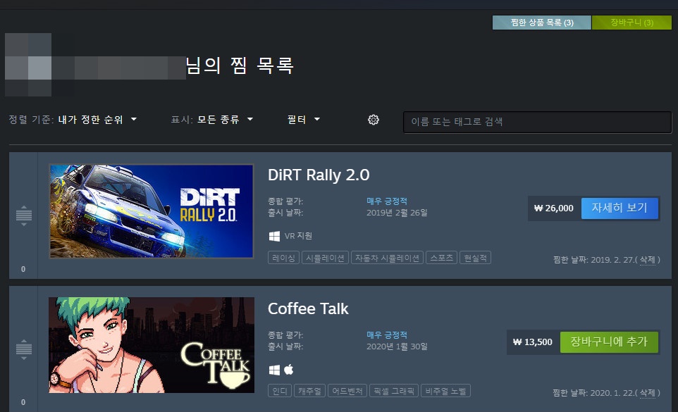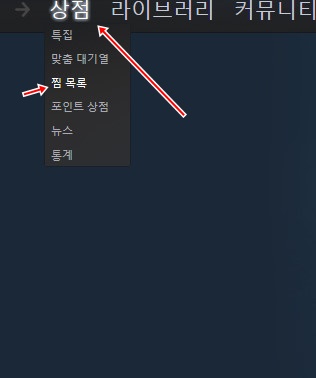 스팀 메인에서 상점 목록에 마우스를 올려보시면 아래 찜 목록 이 나옵니다.