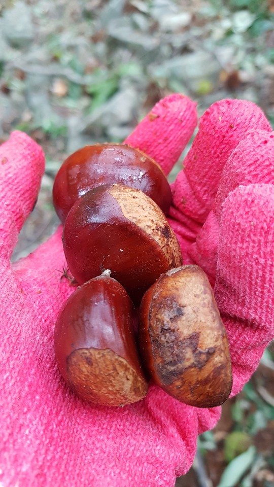 우선 밤을 구해야겠는데요. 시중에서 파는 밤으로 하셔도 좋고, 뒷 산이나~ 가까운 밤 밭이 있다면 주워도 좋습니다. 다만 올해는 큰 태풍이 늦게 2개나 지나가서 그런지 실~하고 좋은 밤이 작년에 비하면 별로 없더라고요. ㅠㅠ 산에 가서 밤을 주으신다면, 뱀을 조심하셔야 합니다. 아직 낮에는 따뜻해서 동면에 들어가지 않은 뱀이 있어요!