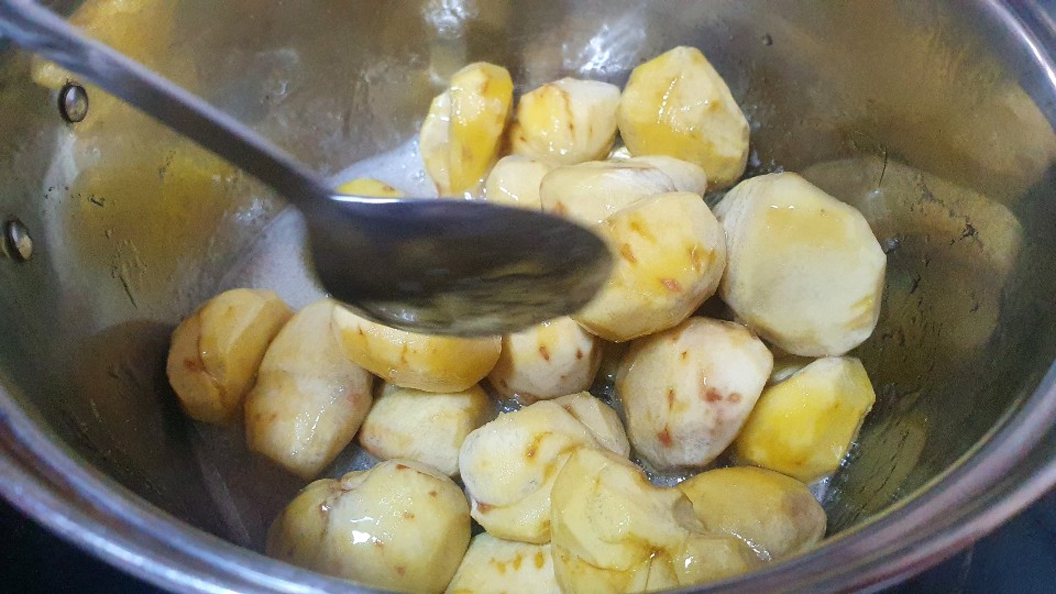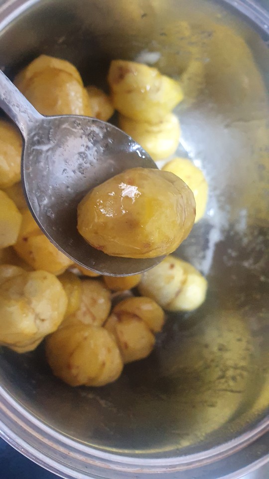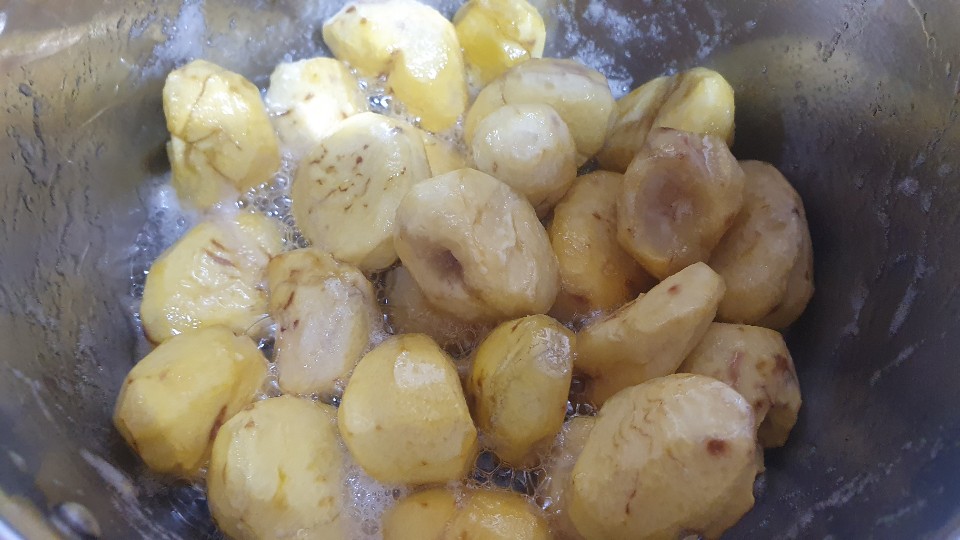 어느 순간부터 달달한 양념이 밤에 스며들면서 밤 색이 변하기 시작합니다.