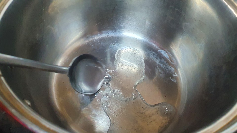 웍~ 냄비 아무것이나 좋습니다. 인덕션 기준으로 10단으로 조금 달구고 나서 열이 좀 올라오면, 6단으로 낮춰줍니다.그리고 올리고당을 2 큰술 풀어줍니다.