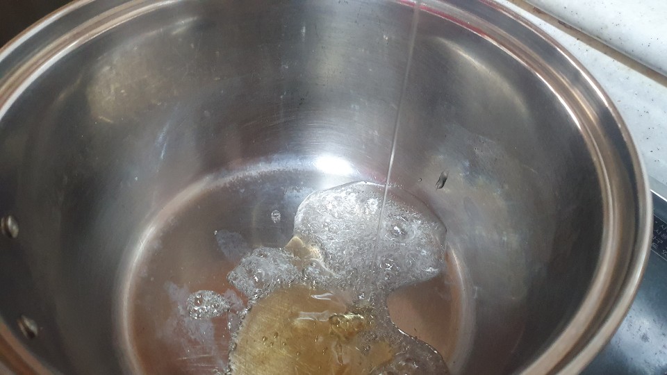 올리고당이 조금 끓어오르면, 꿀을 투척해주세요. 양은 올리고당과 마찬가지로 2 큰술 해주시면 됩니다.