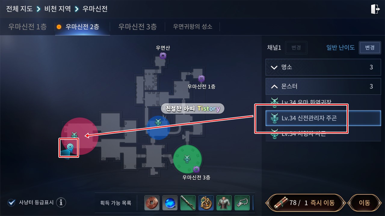 우마신의 석상 위치는 신전 2층에 신전관리자 주곤이 출몰하는 곳으로 이동하시면 쉽게 찾을 수 있습니다.