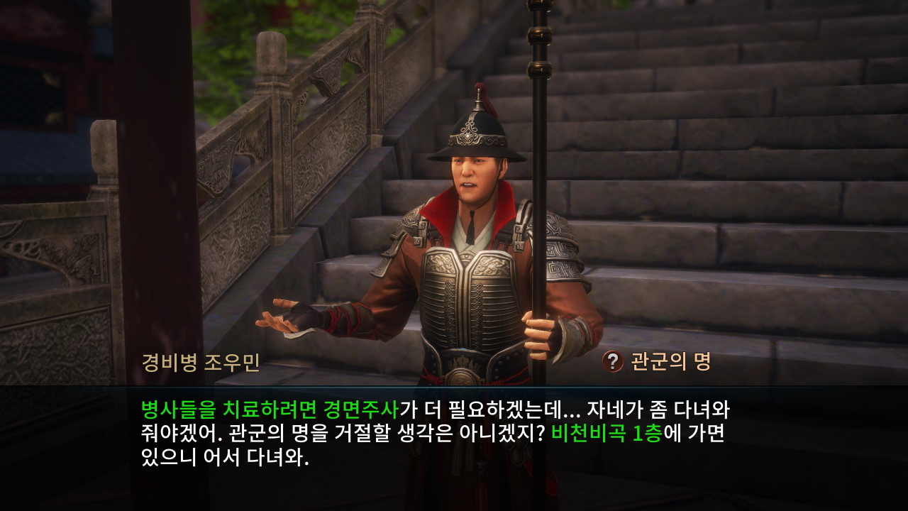 어이, 거기! 일 좀 하나 도와야겠어. 빌어먹을 침입자 놈들! 내가 없는 사이에 내 부하들을 때려눕혔더군. 반란 분자인지 모르겠는데, 사람 귀찮게 하는 데는 일가견이 있어. 몹쓸 녀석들 같으니라고. 병사들을 치료하려면 경면주사가 더 필요하겠는데. 자네가 좀 다녀와 줘야겠어. 관군의 명을 거절할 생각은 아니겠지? 비천비곡 1층에 가면 있으니 어서 다녀와.