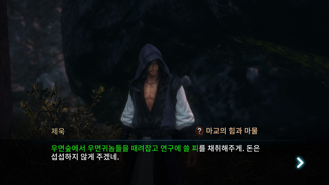 신물은 탐나지만, 교주가 이곳에 있다면 피해야겠지. 우면숲에서 마기가 느껴지는데, 교주가 이곳에 있었다면 마기에 물든 꽃도 피었을 걸세. 좀 찾아봐 주게.