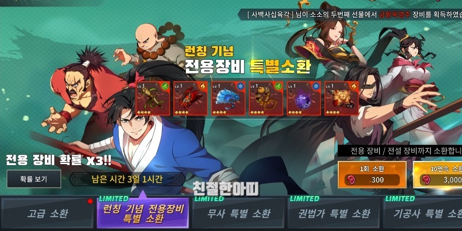 5. 메뉴 ▶ 장비소환 ▶ 고급 소환에서 1회 무료 소환 ▶런칭 기념 전용장비 특별 소환 10회 해줍니다.