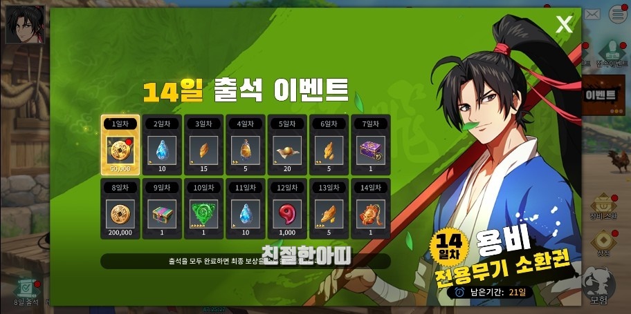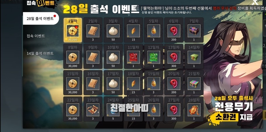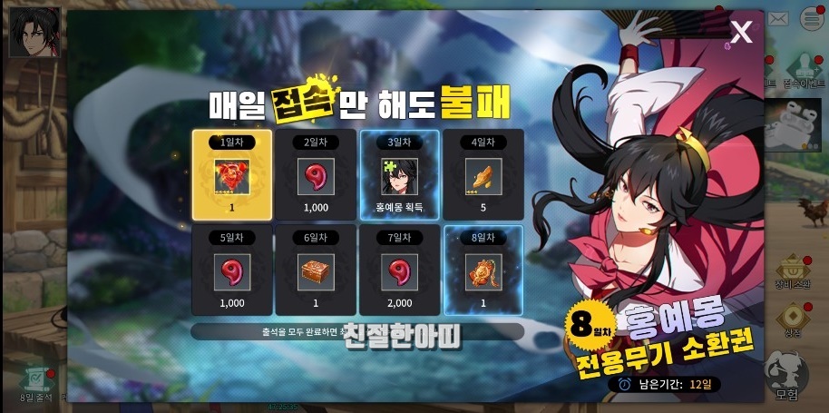 8. 접속 이벤트로 홍예몽 전용무기, 용비 전용무기등을 획득 할 수 있습니다.