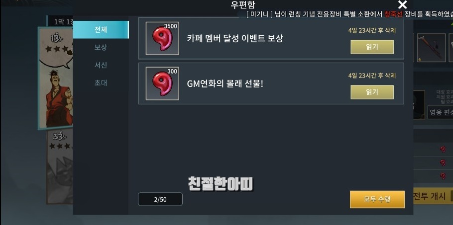4. 우편으로 들어가서 홍옥 보상을 받아 줍니다.