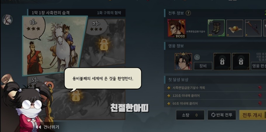 3. 메인 화면으로 오면 우측 하단 캐릭터쪽에 '건너뛰기'가 나옵니다. 눌러주시면 됩니다.