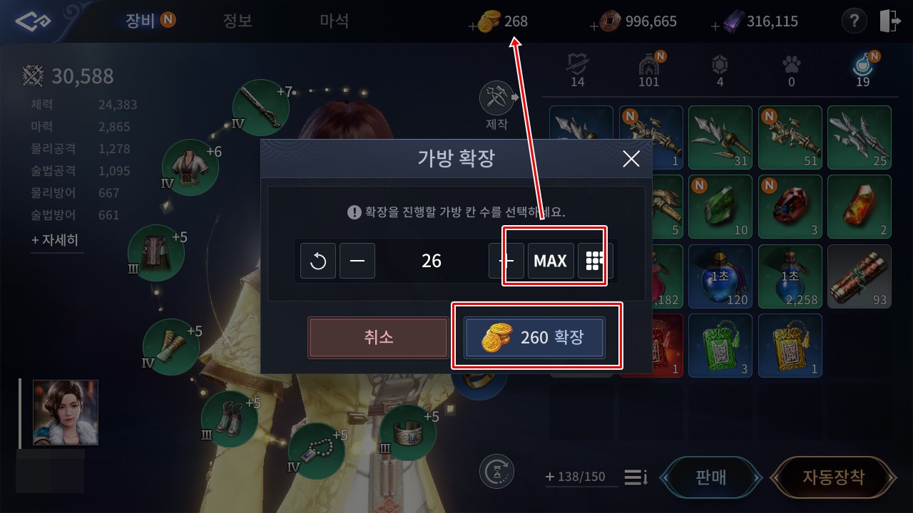 MAX 누르면 현재 본인이 보유하고 있는 금화 만큼 확장이 가능합니다.