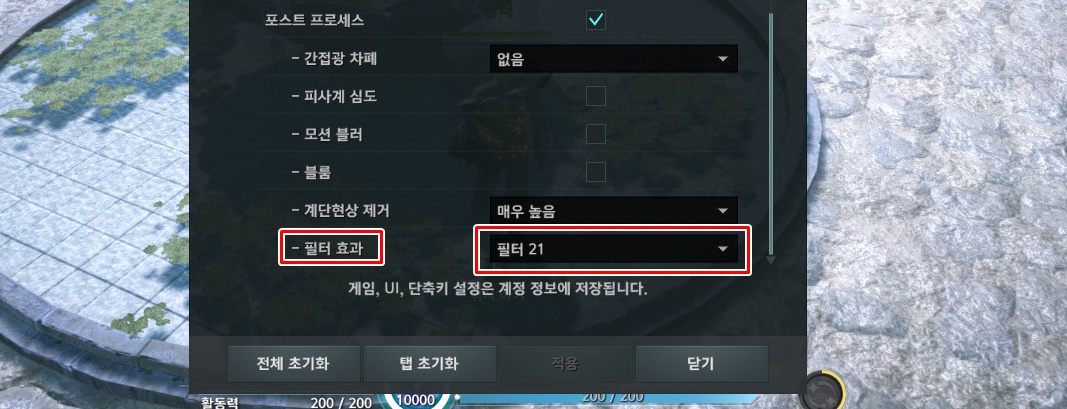 엘리온 - 설정 - 그래픽 - 맨 밑으로 내려오면 필터 효과를 변경 할 수 있습니다.