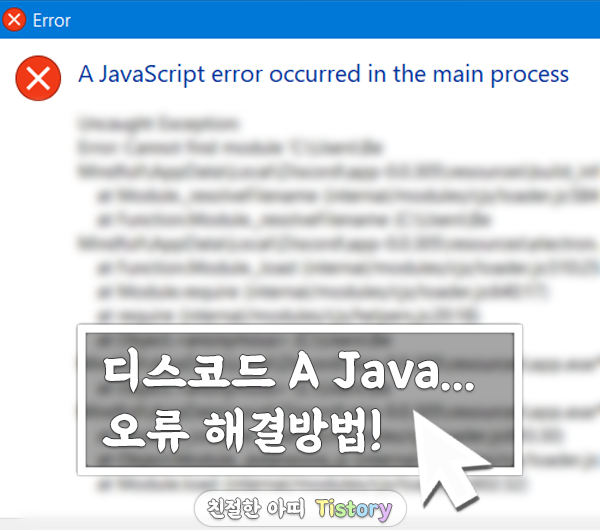 친구들과 디스코드로 게임을 같이하거나 대화를 하거나 여러가지를 디스코드로 하게 되었는데요. 가끔~ 디스코드 이용을 하다보면 뜨는 오류가 몇가지 있는데. 그 중에서도 A JavaScript error occurred in the main porcess 가 있습니다. 해당 오류를 해결하는 방법에 대해 알려드리겠습니다. 굉장히 쉬워요!