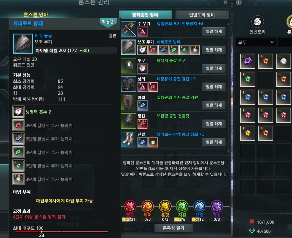 장비 마다 색깔별로 나뉘는 룬스톤을 착용하여, 다양한 룬특성을 찍어 게임 플레이 스타일을 변경 할 수 있는 엘리온의 전투시스템 중 하나 입니다.