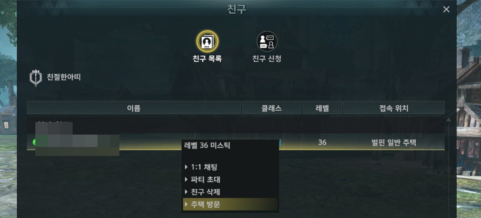 엘리온 친구 목록을 열어서 주택 방문을 해줍니다.