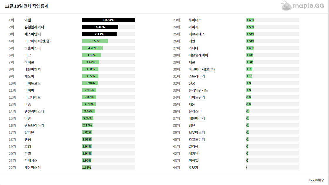 거의 모든 서버에서 10%에 근접하는 유저 비율을 보이고 있는 모습을 확인 할 수 있습니다. 메이플 크로아 서버에서는 압도적 1위로 12.15%를 차지하고 있는데요. 이 %는 점점 증가하고 있는 추세입니다. 메이플 스토리에서 아델을 견재 할 수 있는 신규 직업이 등자하지 않는다면 아델은 앞으로 계속해서 승승장구 할 것으로 보입니다. 참고로 아델은 너프를 몇번이고 당했음에도 이런 인기를 보여주고 있습니다.