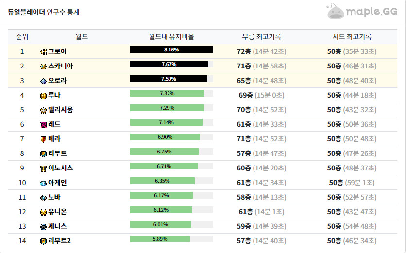 아델과 달리 듀얼블레이드의 인구 통계는 1,2위만 같고 3위부터는 다른 모습을 보여줍니다. 전체 인기도 2위가 하는 직업이지만 전체 서버에서 10%를 넘기는 곳은 없습니다. 크로아 서버에서 8.16%를 보여줍니다. 무릉 기록은 아델보다 높습니다. 듀얼블레이드의 전직 트리는 초보자로 시작하여, 로그 → 세미듀어러 →듀어러 →듀얼마스터 →슬래셔 →듀얼블레이더로 이어집니다.