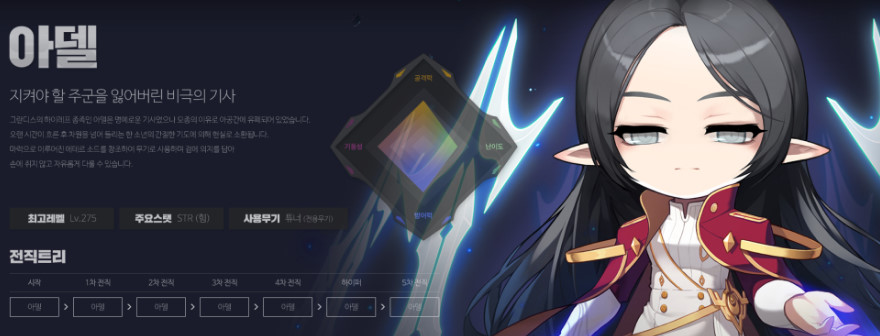 아델은 2020년 1월 업데이트로 등장한 직업으로 빠른 공격 속도와 준수한 딜 이동기까지 모두 갖추고 있는 극강의 캐릭터입니다. 무자본, 중자본, 고자본 모두 키우기 좋은 직업으로 평가 받고 있으며 스킬자체 계수도 좋으며, 화려하기 때문에 초보자들이 하기에도 매우 좋습니다.