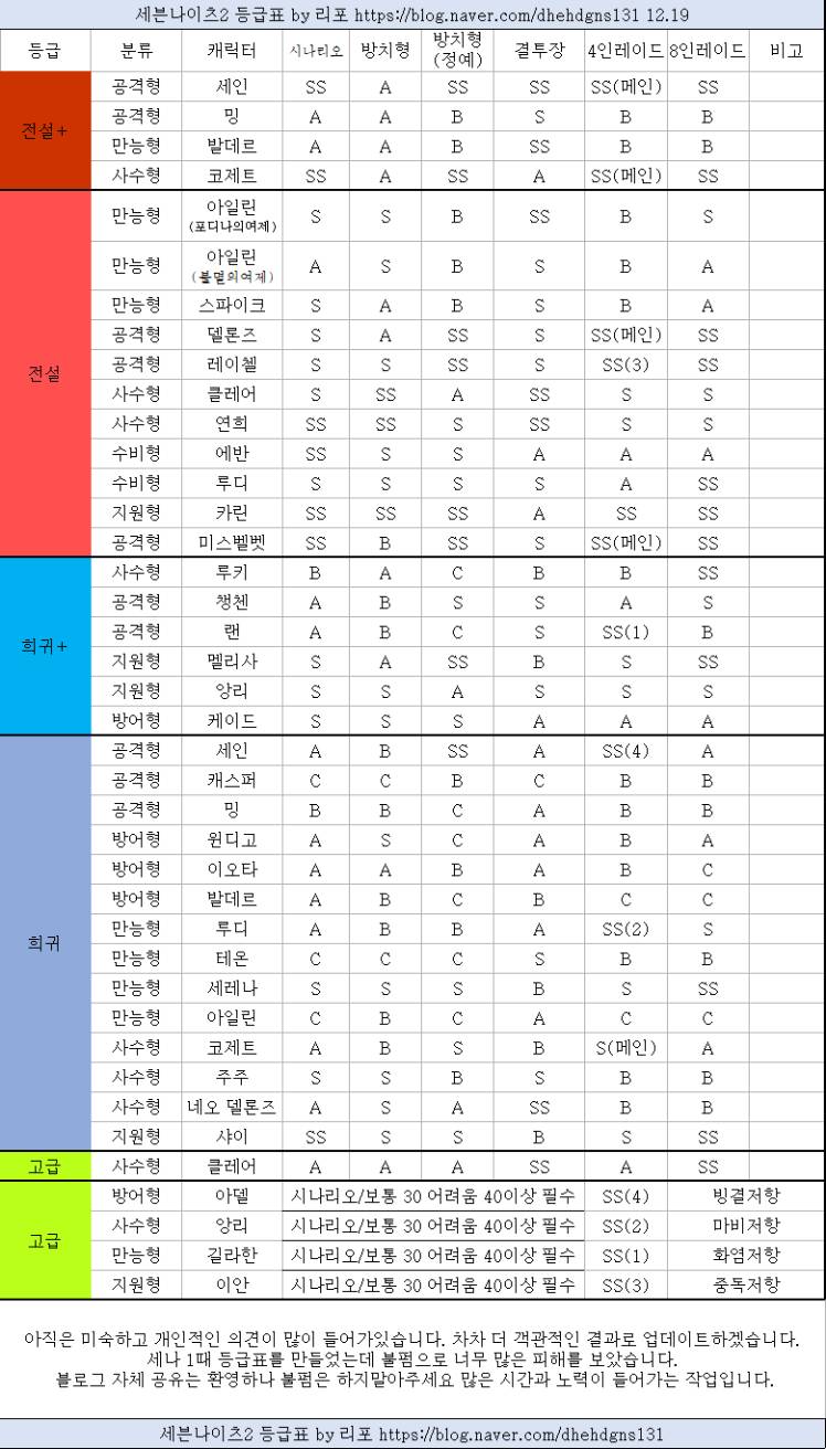 해당 등급표는 Ripo 님께서 직접 작성하신 것인데요. 아띠도 세나2를 플레이하고 있는 입장에서 상당히 공감이 많이 되는 등급표입니다. 개인차는 있겠지만 신뢰도는 90% 이상이라고 보여지내요. 캐릭터들의 개인 능력이 저런것이니 조합에 따라 많이 달라질 수 있는 게임이 또 세븐나이츠2 입니다.