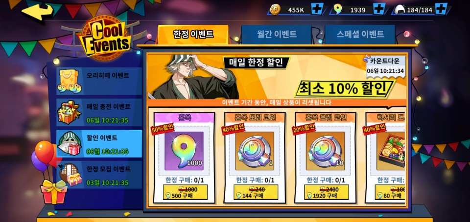 4. 한정 이벤트 - 할인 이벤트로 이동하여 혼옥 500개로 1000개를 구매합니다.
