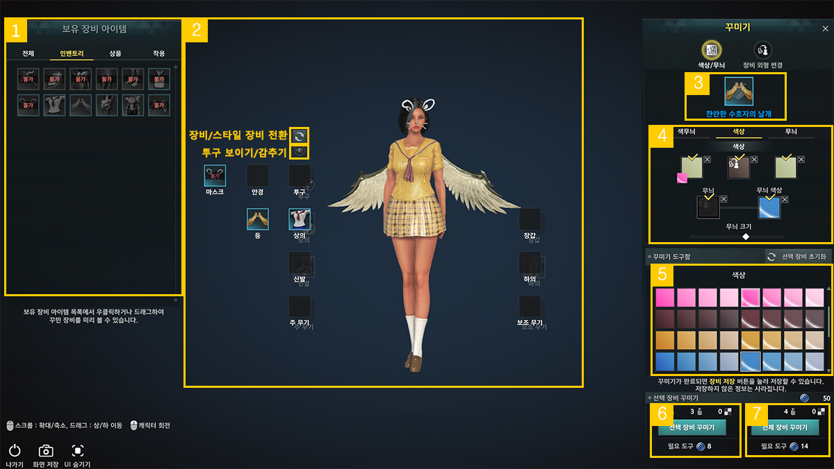 | ⑥ 선택 장비 꾸미기 | ③번에서 선택된 현재 장비에만 꾸미기 결과를 적용합니다. 꾸미기 버튼 위아래 표시되는 정보로 적용한 무늬/색상의 개수와 필요한 꾸미기 도구 수량을 확인할 수 있습니다. |
