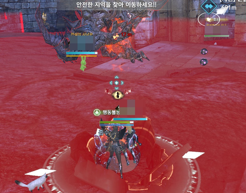 4번에 많은 분들이 죽으시는데. 이 공격은 장판 밖으로 나가거나 장판 안에 있더라도 구조물 뒤에 숨으면 된다. 가장 안전한 방법은 위 스크린샷에서 확인할 수 있듯이 크카툼이 불덩이로 뱉어낸 구조물 안에 들어가는 거다.