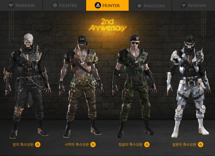 헌터 2주년 아바타는 군대를 생각나게 하는 밀리터리 아바타(룩)입니다. 스카우터 / 호크아이 / 데빌헌터 / 블래스터 모두 동일하게 적용 됩니다. 총과 활을 쏘는 직업이니 밀리터리 룩이 어울리는거 같습니다.