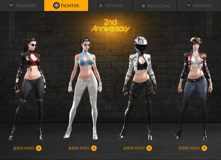 무도가 배틀마스터 / 인파이터 / 창술사 / 기공사의 2주년 아바타는 의상이 라이더 컨셉을 가지고 있습니다. 각각 개성이 뚜렷한데. 쎈 언니 느낌의 창천의 라이더 / 바지가 하얀색이라 청바지 느낌보다 살짝 레깅스 느낌이 나서 운동복 입고 조깅하는 호천의 라이더 / 누가봐도 당장 바이크 타고 날아갈거 같은 상천의 라이더 / 그리고 청바지 느낌을 가장 잘 살려서 유쾌하고 활발한 느낌을 주는 민천의 라이더 아바타가 있습니다.