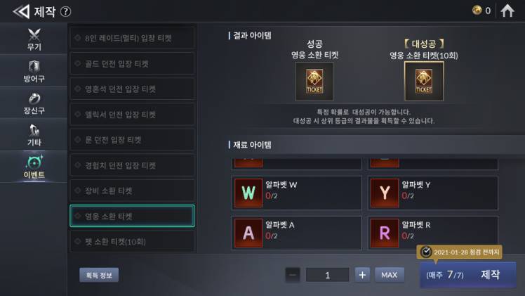 | 알파벳 / 영웅 소환권 1개 (대성공 10회) | 주 7회 | 14개 | |