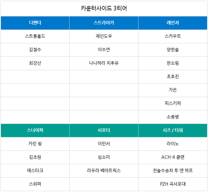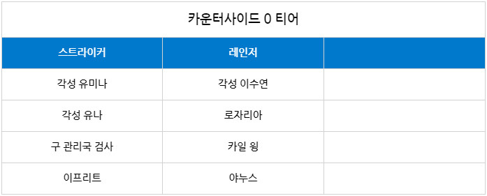 카운터사이드에서 1티어 이상의 성능을 발휘하는 직업군은 스트라이커와 레인저만 있다. 고인물들은 이 들을 적폐티어라고 부르기도 하는데. 스트라이커에서 각성 유미나, 유나는 이 중에서도 독보적이며, 레인저에서는 각성 이수연과 카일 윙이 최고다.