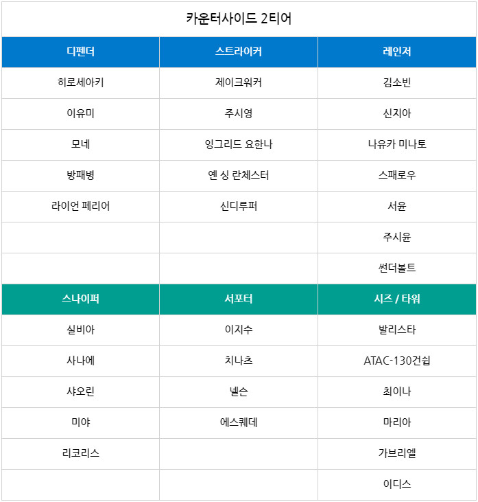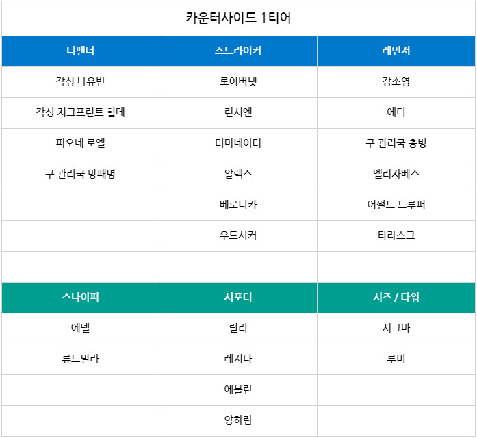 1티어급 성능을 발휘하는 캐릭터들이다. 스트라이커와 레인저는 워낙 성능 좋은 캐릭터가 많아서 1티어, 2티어에 올라오는 캐릭터도 많은 편