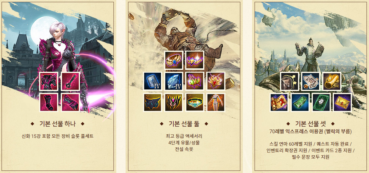 서비스 이관 이벤트에 참여하면, 신화 15강 포함 모든 장비 슬롯 풀세트와, 최고 등급 액세서리 4단계 유물 성물 전설 '속옷' 그리고 70레벨 익스프레스 이용권을 지급한다.