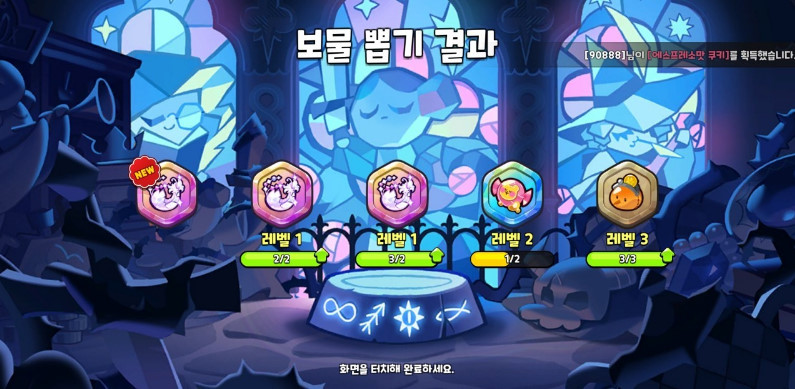 이렇게 깃털을 3개나 뽑을 수 도 있습니다. 보물들의 성능 향상이 매우 높기 때문에 5인 쿠키 세트를 적당히 맞췄다면 그 후에는 크리스탈로 쿠키 뽑기보다 보물 뽑기를 해주는게 좋습니다.