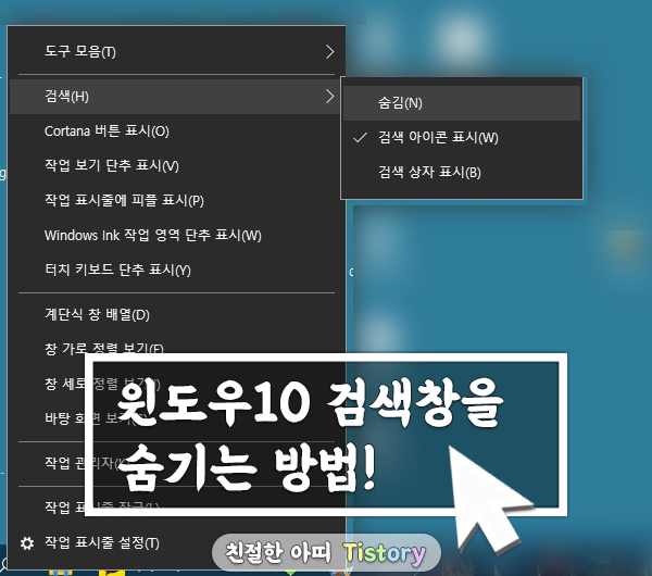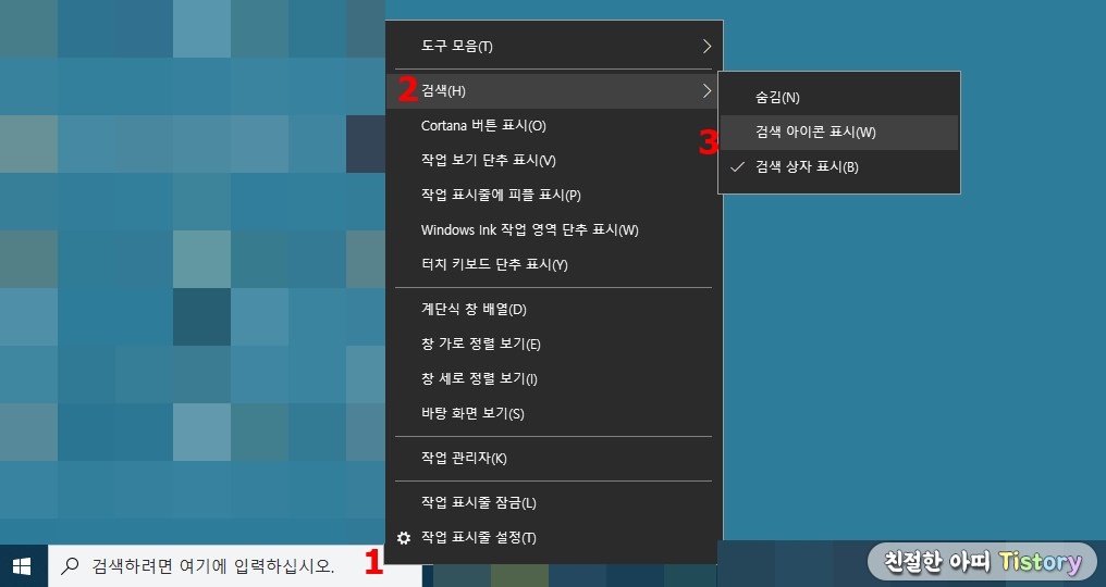 검색하실게 있으시면, 아이콘 클릭하시면 작업표시줄 윗쪽으로 검색화면이 따로 나오게 됩니다. 그래서 저는 이렇게 아이콘 표시로 해놓고 사용하고 있습니다. 보기도 좋고~ 가끔 검색창도 이용하니까요. 그럼 아예 없애 버리고 싶다면?