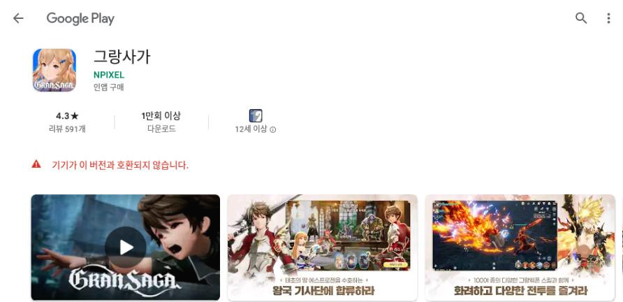 그랑사가 기기가 이 버전과 호환되지 않습니다.