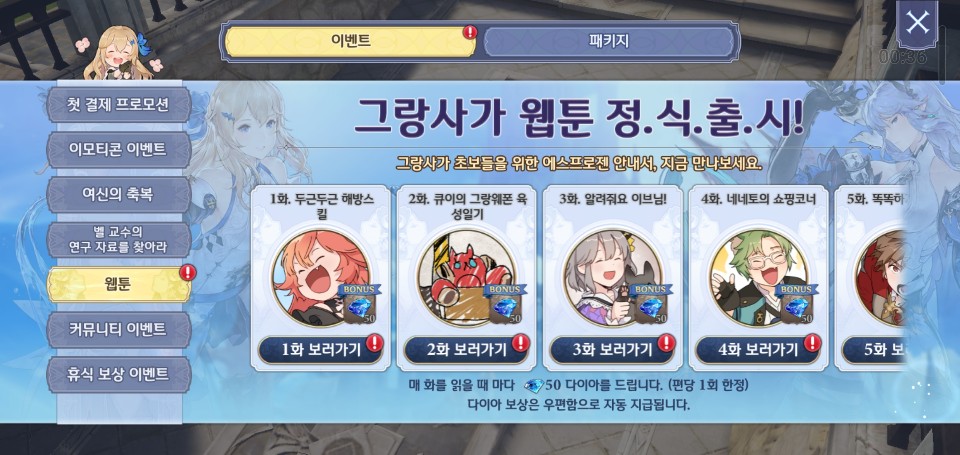 각 1화마다 보너스로 크리스탈 50개를 받을 수 있습니다.