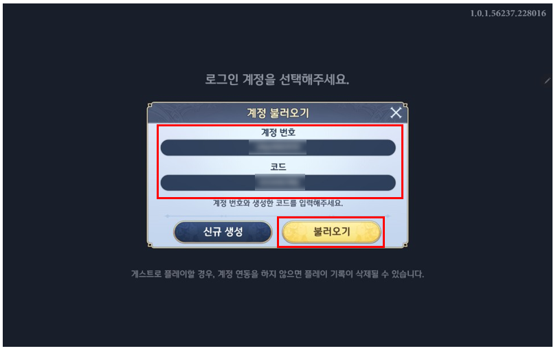 6. PC 버전의 계정 번호와 생성하신 코드를 입력 후 불러오기 버튼을 눌러주세요.