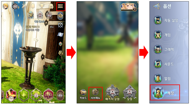 1. 게임 화면 상단의 메뉴에서 ‘서브 메뉴’의 옵션 → 계정 항목을 터치해주세요.