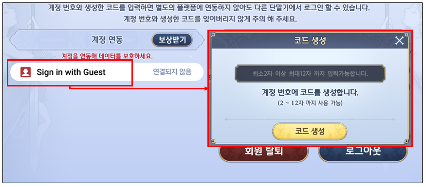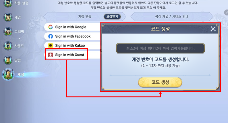3. 계정 연동 하단 Sign in with Guest 영역 터치 → 코드 생성 창에서 최소 2자 ~