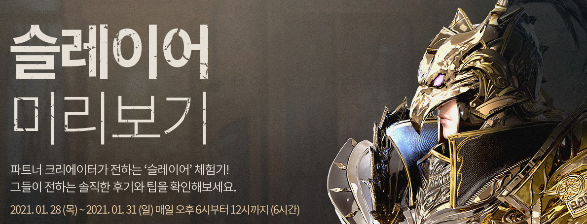 2월 3일 업데이트를 앞두고 있는 엘리온 신규 클래스 '슬레이어'는 남자의 로망이라고 할 수 있는 양손 대검을 휘두르며 적을 분쇄시켜 버리는 캐릭터인데요. 1월 28일~ 1월 31일까지 개인방송 크리에이터들이 사전 플레이를 진행하여 광고를 한다고 합니다.