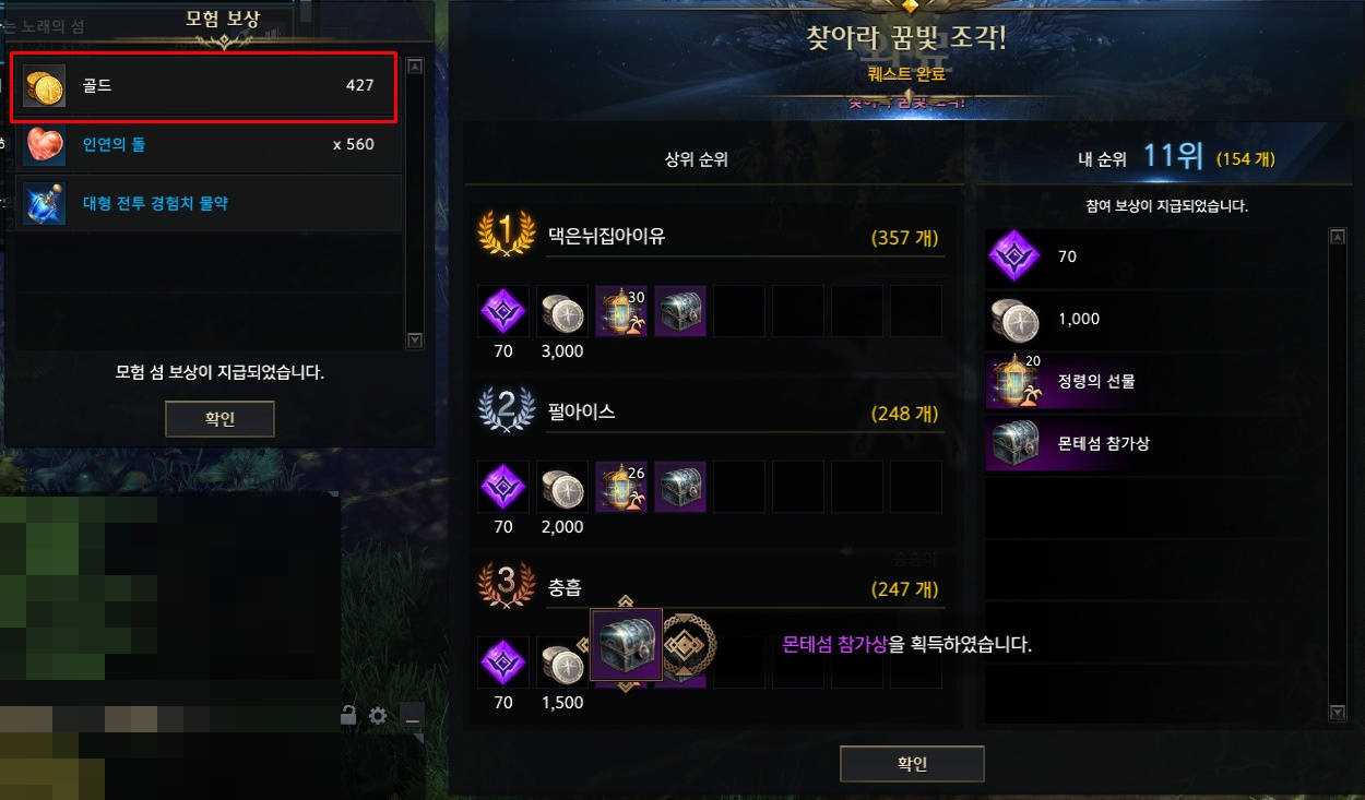 찾아라 꿈빛 조각! 퀘스트 완료와 함께 모험 보상을 받을 수 있어요. 제 순위는 11위네요!