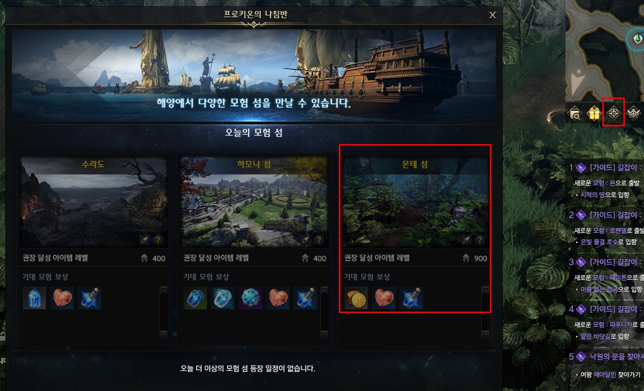 미니 맵 아래 3번째 나침반 아이콘을 눌러보면 오늘 모험 할 수 있는 주요 섬을 보여줍니다. 그리고 화면 좌측 상단을 보시면 시작 10분전 5분전을 알려주니까! 미리 대비할 수 있어요.