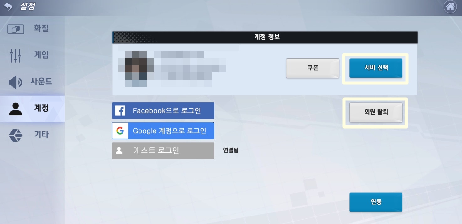 5. 원하는 캐릭터가 나오지 않았다면, 서버 선택을 눌러서 서버 변경을 통해 다른서버에서 리세마라를 진행