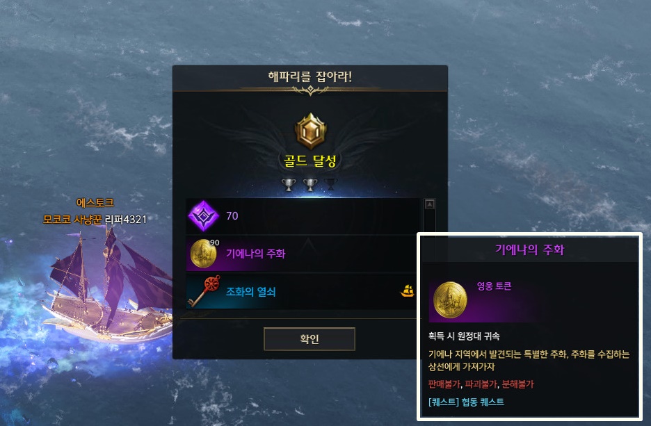 보상으로 기에나의 주화, 조화의 열쇠 등을 얻을 수 있습니다. 기에나의 주화는 협동 퀘스트로 또는 이벤트 보상으로만 받을 수 있기 때문에 꼭 돌아주시는게 좋습니다.
