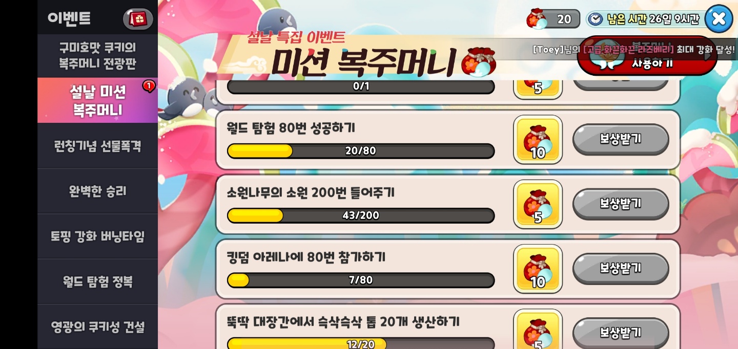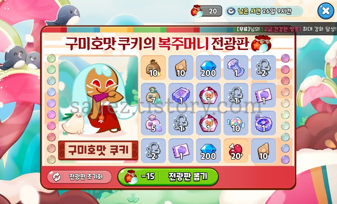 구미호맛 쿠키가 추가 되면서 복주머니 전광판 이벤트가 시작됬어요. 탐험,아레나, 소원나무, 곰젤리 열기구, 열차 등을 진행하면 복주머니 보상을 받을 수 있고 이 복주머니를 소모해서 크리스탈, 뽑기권 등을 받을 수 있답니다.