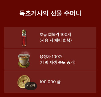 사전예약 플랫폼은 구글플레이, 앱스토어에서 기본 사전예약 보상으로 약속 의상과 독초거사의 선물주머니를 받을 수 있습니다.