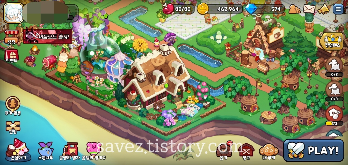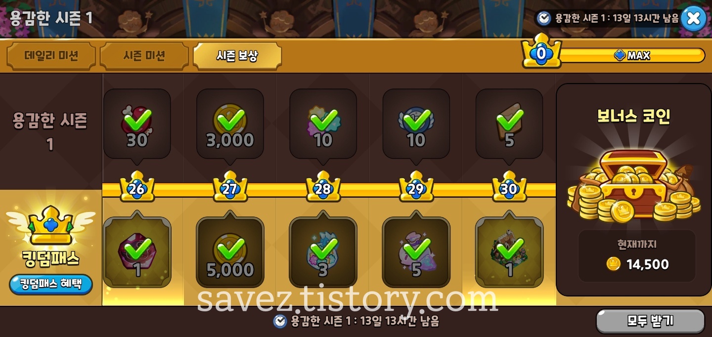 쿠키런 킹덤 패스 혜택을 끝까지 완료하면 에브리쿠키 가든하우스를 받을 수 있어요! 스크린샷을 찍은 시간이 용감한 시즌1 기간은 이제 13일 13시간 남았네요? 매일 데일리 미션과 시즌미션으로 보상을 받을 수 있기 때문에 되도록이면 30일 이상 남았을때 하시는게 좋아요. 2월 24일쯤이면 용감한 시즌2가 시작할 것으로 예상 됩니다!